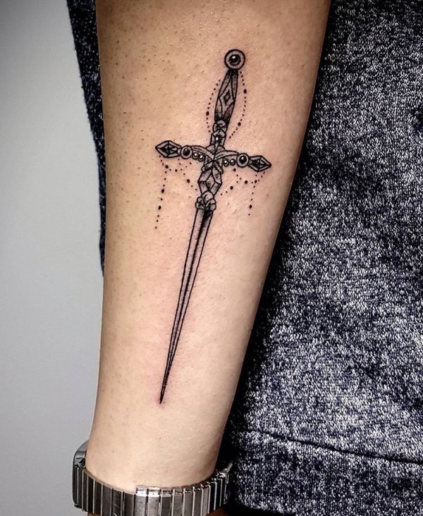 手臂上帅气的黑色装饰剑纹身图片