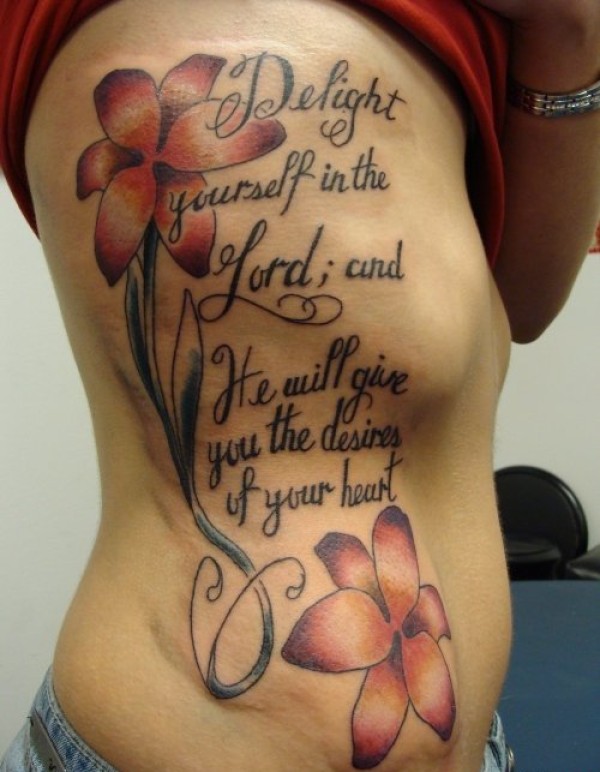 女子侧肋上漂亮的花朵和英文圣经文字纹身