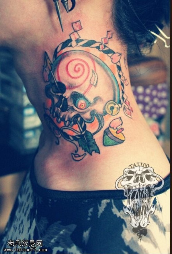 脖子上个性十足的彩色骷髅纹身_脖子纹身图案大全_纹身图吧