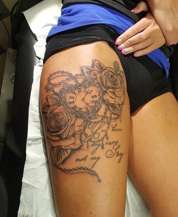 性感女子右大腿黑灰色时钟玫瑰花英文字纹身图片