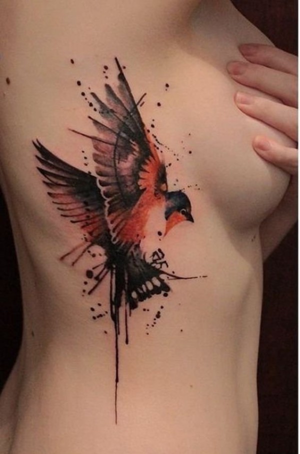 女性右侧肋上漂亮的水彩鸟纹身图片