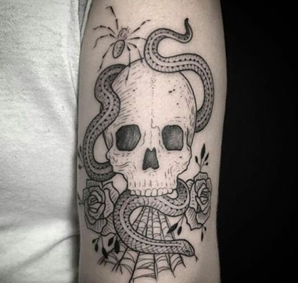 手臂上帅气的黑色骷髅头和蛇纹身图片