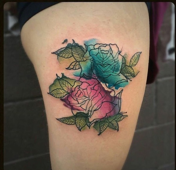 女性大腿上漂亮的线条轮廓水彩花卉纹身图片