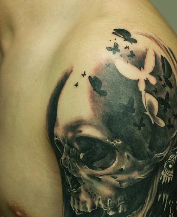 大臂个性十足的黑灰骷髅纹身图案