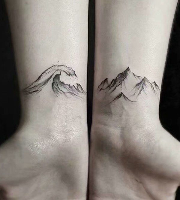 适合情侣的手腕点刺山脉海浪纹身图案