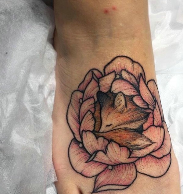 隐藏在花瓣中的小狐狸脚背纹身图案