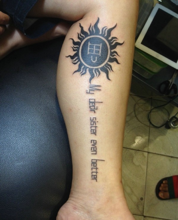 个性英文与个性太阳的腿部纹身图案