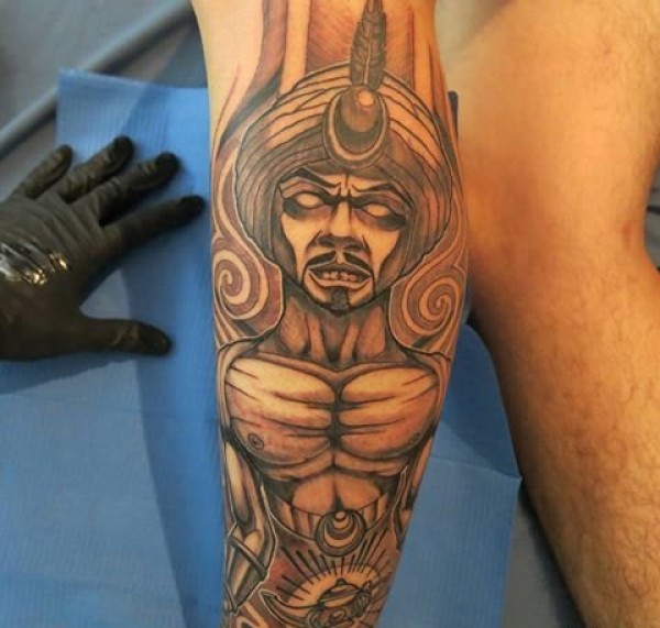 小腿上帅气的黑灰色阿拉丁与神灯纹身图片