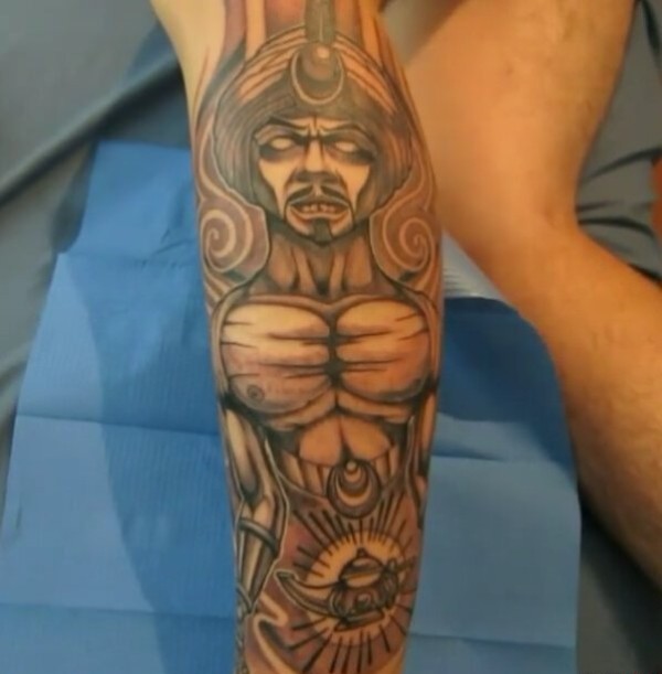小腿上帅气的黑灰色阿拉丁与神灯纹身图片