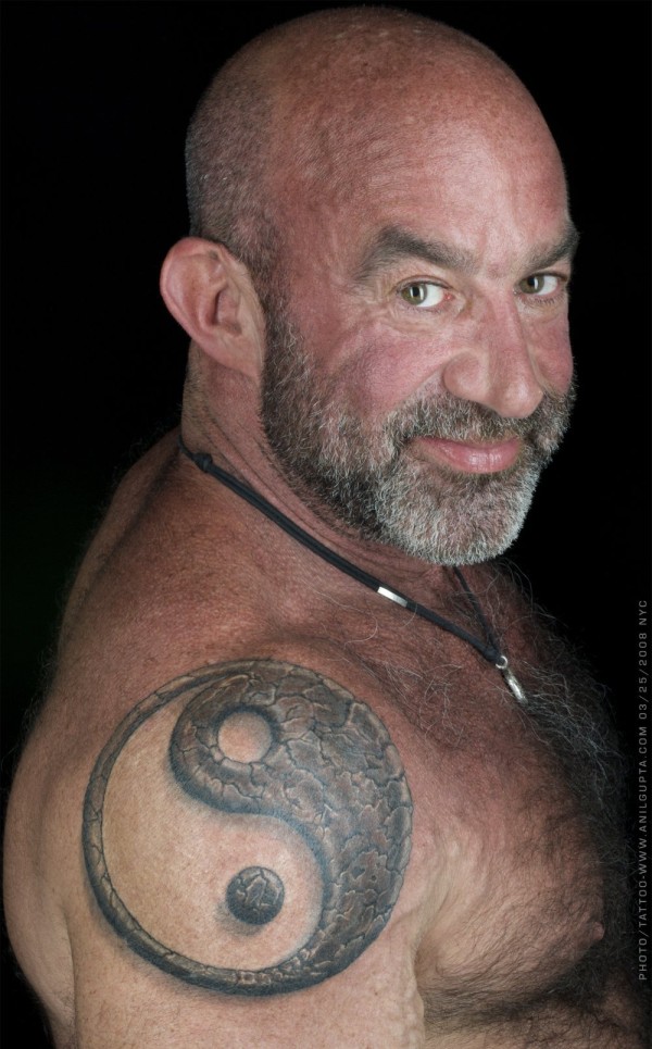 男子右肩膀上霸气的3D石裂阴阳八卦纹身图片