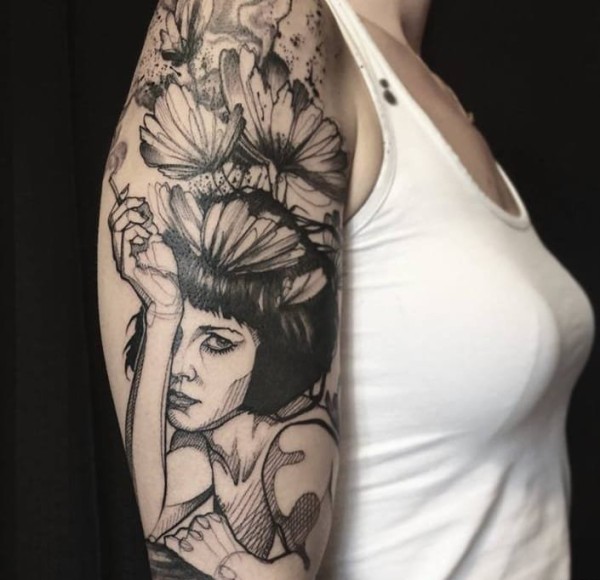 男人大臂黑白彼岸花骷髅_黑白纹身图案大全_纹身图吧