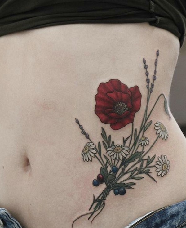 火辣美女腰部上的花朵纹身刺青
