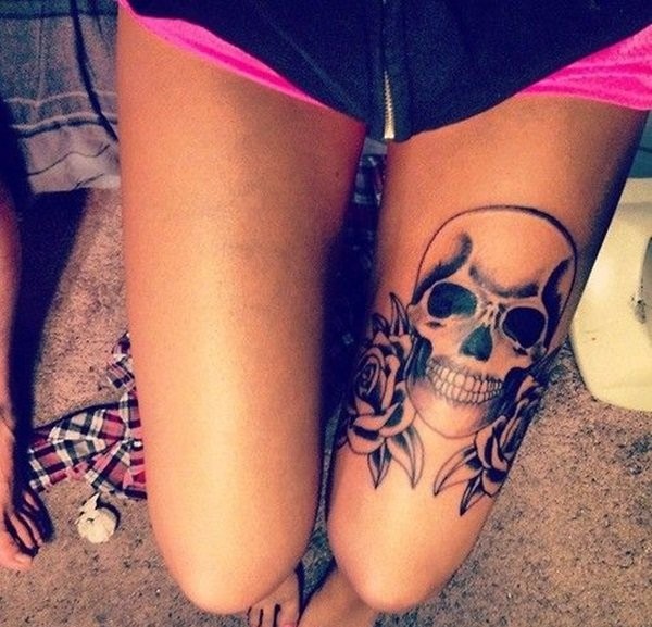 女性大腿上超性感的骷髅头纹身图案