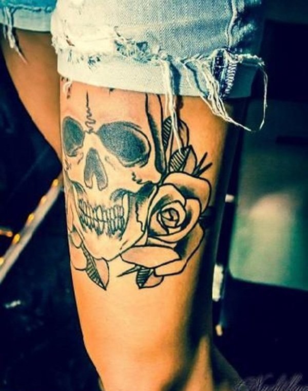 女生手臂经典潮流的骷髅与玫瑰花纹身图案