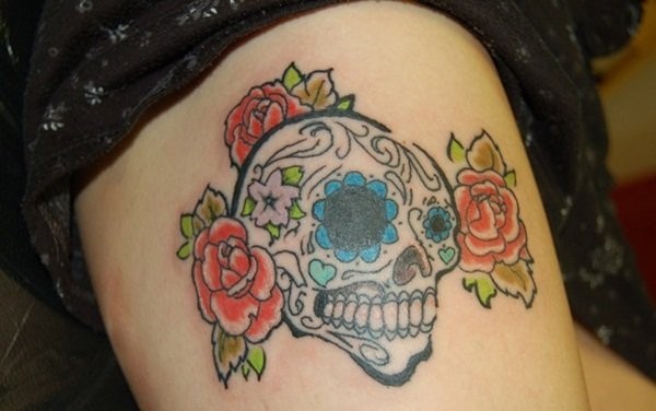 女性大腿上超性感的骷髅头纹身图案
