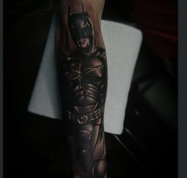 手臂上帅气的黑色现实风格蝙蝠侠纹身图片
