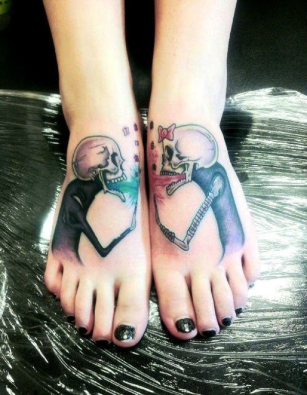 女性双脚上的同款匹配的纹身图案