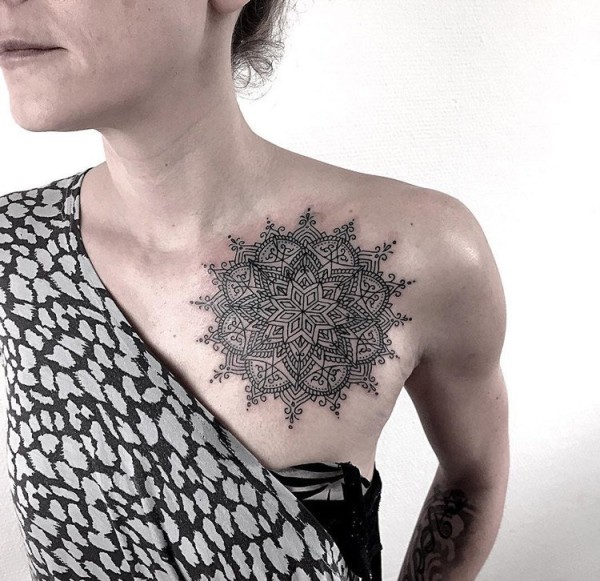 女人左胸部上精致的装饰风格曼陀罗花纹身图片