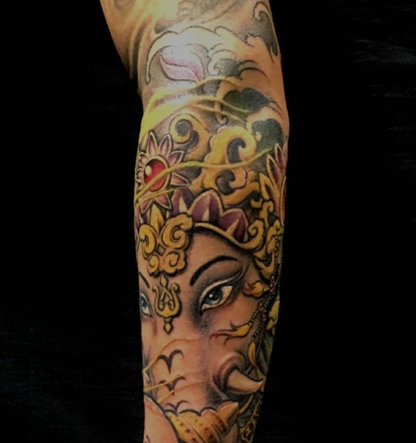 花臂新时尚彩色象神纹身图案