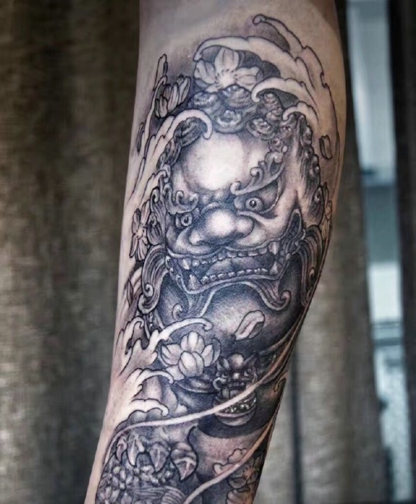 花臂一款老传统唐狮纹身图案
