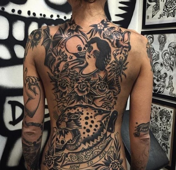 男子喜爱的头骨和人物头像和动物的满背纹身图案