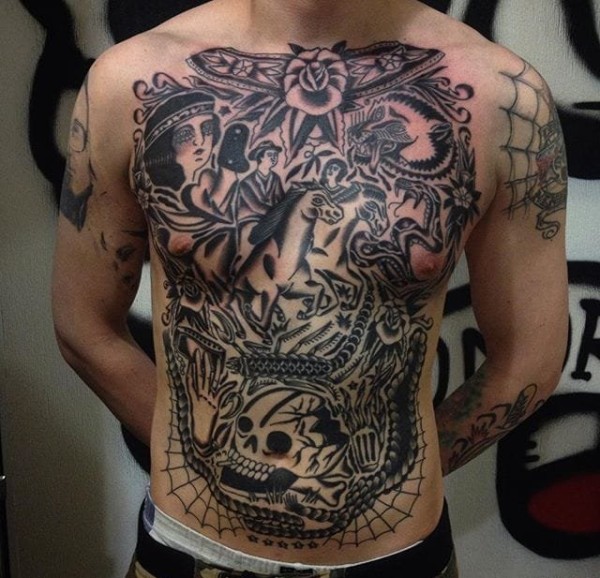 男子喜爱的头骨和人物头像和动物的满背纹身图案