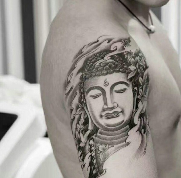 手臂黑灰佛像纹身图案魅力十足