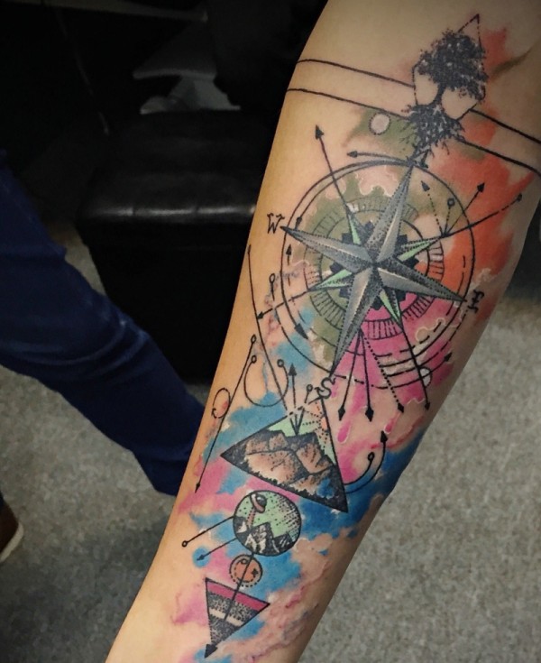 手臂时尚水彩指南针纹身图案