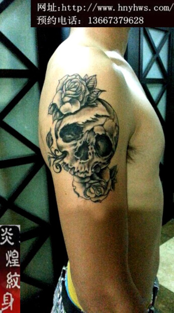 女生手臂经典潮流的骷髅与玫瑰花纹身图案