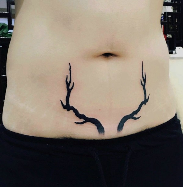 处在女生腹部的两边树枝纹身图案
