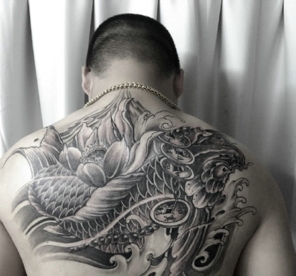 后背黑白传统鲤鱼纹身图案