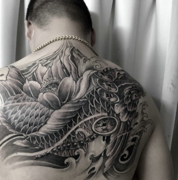后背黑白传统鲤鱼纹身图案