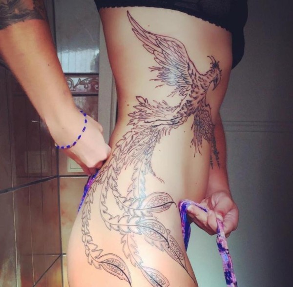 女性侧肋上漂亮的凤凰纹身图案