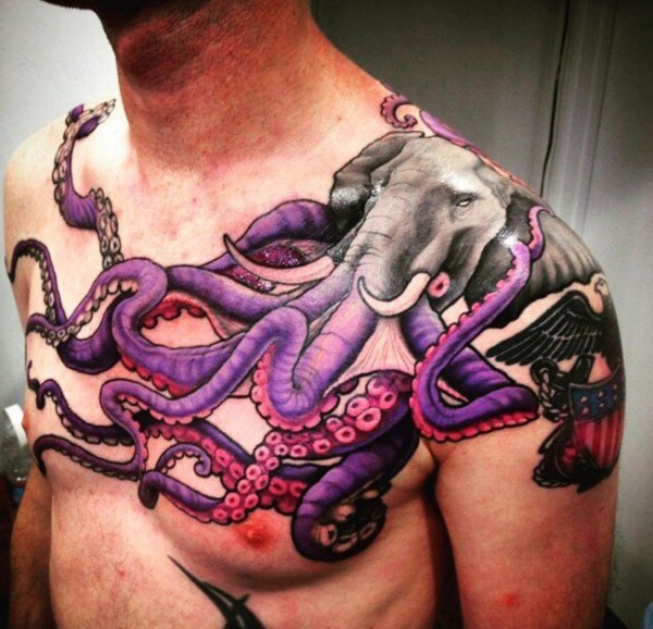 缠绕在肩膀上的漂亮章鱼纹身图案