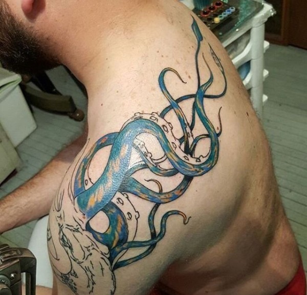 缠绕在肩膀上的漂亮章鱼纹身图案