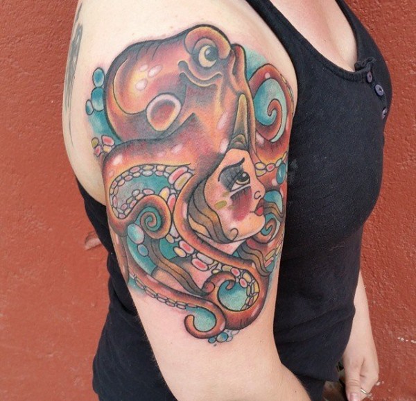 缠绕在肩膀上的漂亮章鱼纹身图案