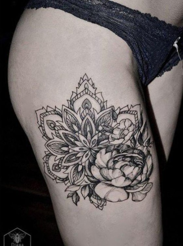 女孩性感大腿上漂亮的装饰风格曼陀罗花纹身图案