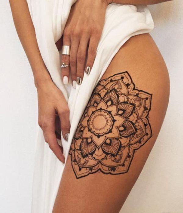 女孩性感大腿上漂亮的装饰风格曼陀罗花纹身图案