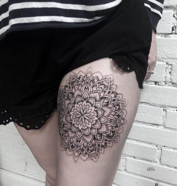 女孩性感大腿上漂亮的装饰风格曼陀罗花纹身图案