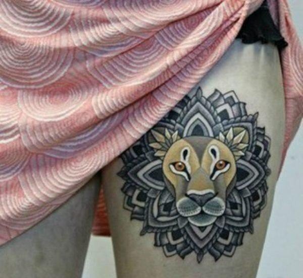 女孩性感大腿上漂亮的装饰风格曼陀罗花纹身图案