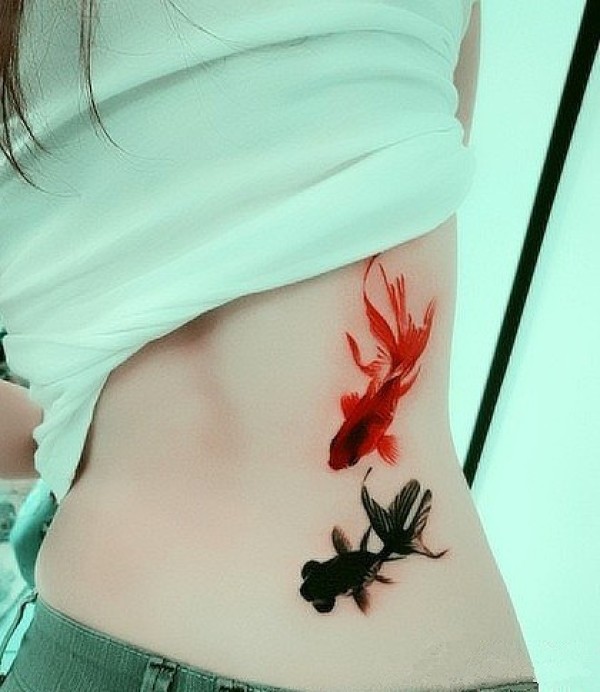 女人腰部黑红金鱼纹身图