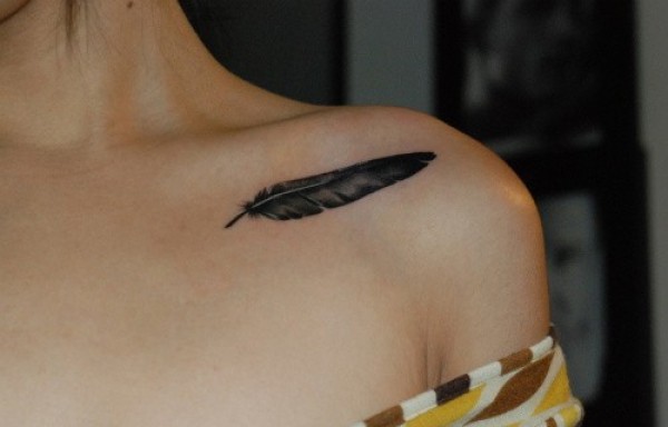 女孩锁骨下羽毛纹身图