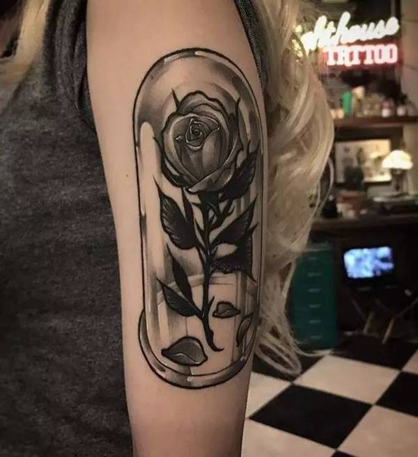 女生手臂经典潮流的骷髅与玫瑰花纹身图案