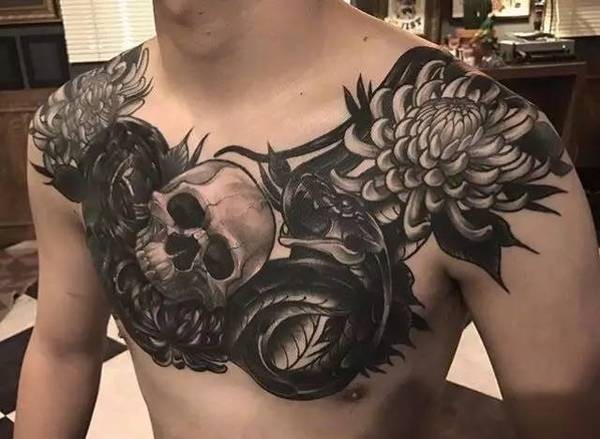 超帅时尚的黑灰骷髅与蛇纹身图案