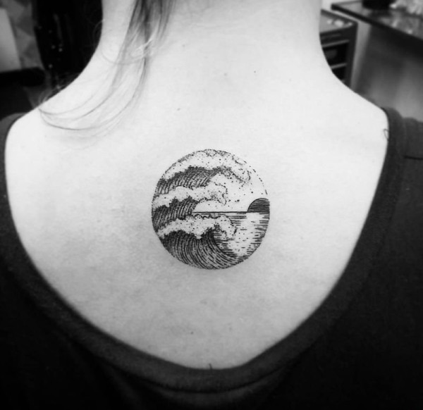 女生后腰纹身黑白灰风格抽象线条纹身图案