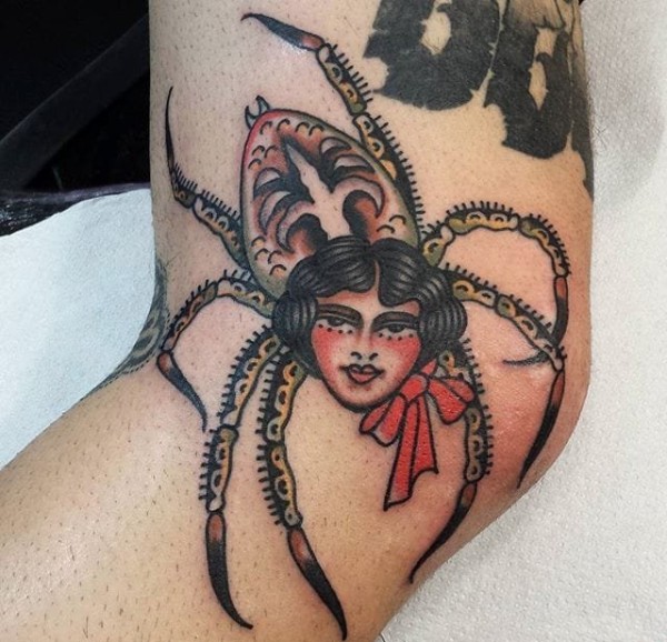 邪恶的女鬼面蜘蛛和蜘蛛网纹身图案
