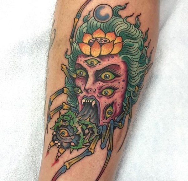 邪恶的女鬼面蜘蛛和蜘蛛网纹身图案