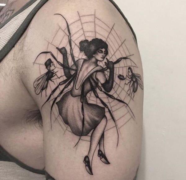 邪恶的女鬼面蜘蛛和蜘蛛网纹身图案