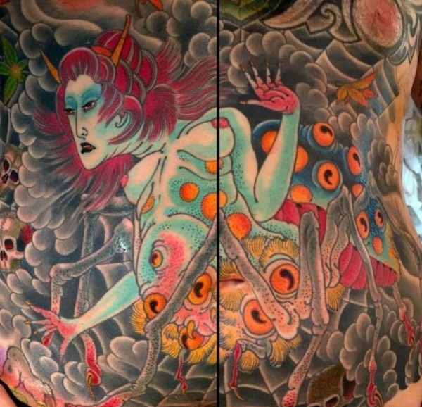邪恶的女鬼面蜘蛛和蜘蛛网纹身图案