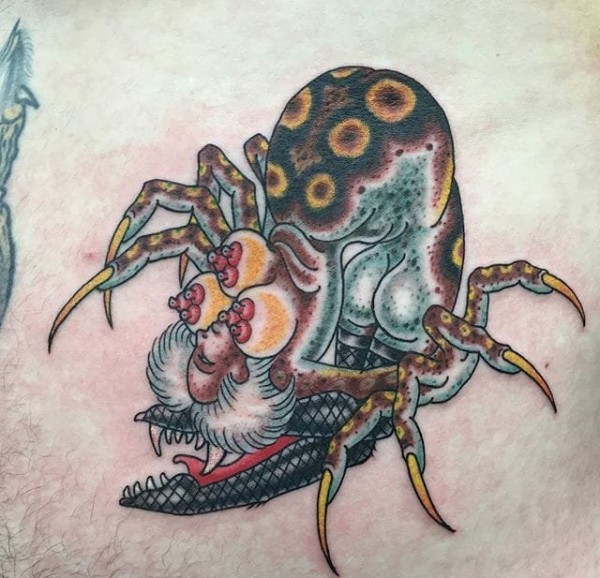 邪恶的女鬼面蜘蛛和蜘蛛网纹身图案